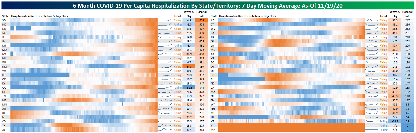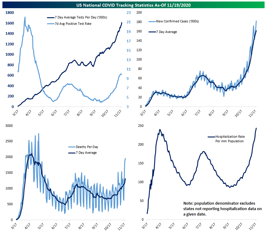 US COVID cases continue to rise sharply. Testing has also risen, but an increase to 10% positive test rates show that this is not simply about more testing. While there’s been a slow down in the percentage growth of confirmed positives that could be a leading indicator of a peak in daily new cases, Thursday’s numbers put a wrench in what had been a promising trend. A peak for daily new cases in the wake of Thanksgiving is still possible, but in the meantime millions of new cases will emerge. At a lag, hospitalizations will follow. Adjusted for the population of states reporting hospitalizations, hospitalization rates have reached new records. Like clockwork, deaths are following. Almost 2,000 Americans died yesterday, and at a lag to cases and then hospitalizations, the trend is accelerating. We update these charts and the analysis that goes with them every morning in our pre-market report The Morning Lineup. Click here to start a free trial to Bespoke Institutional and receive our daily Morning Lineup for the next two weeks, featuring more commentary and data on macro markets.