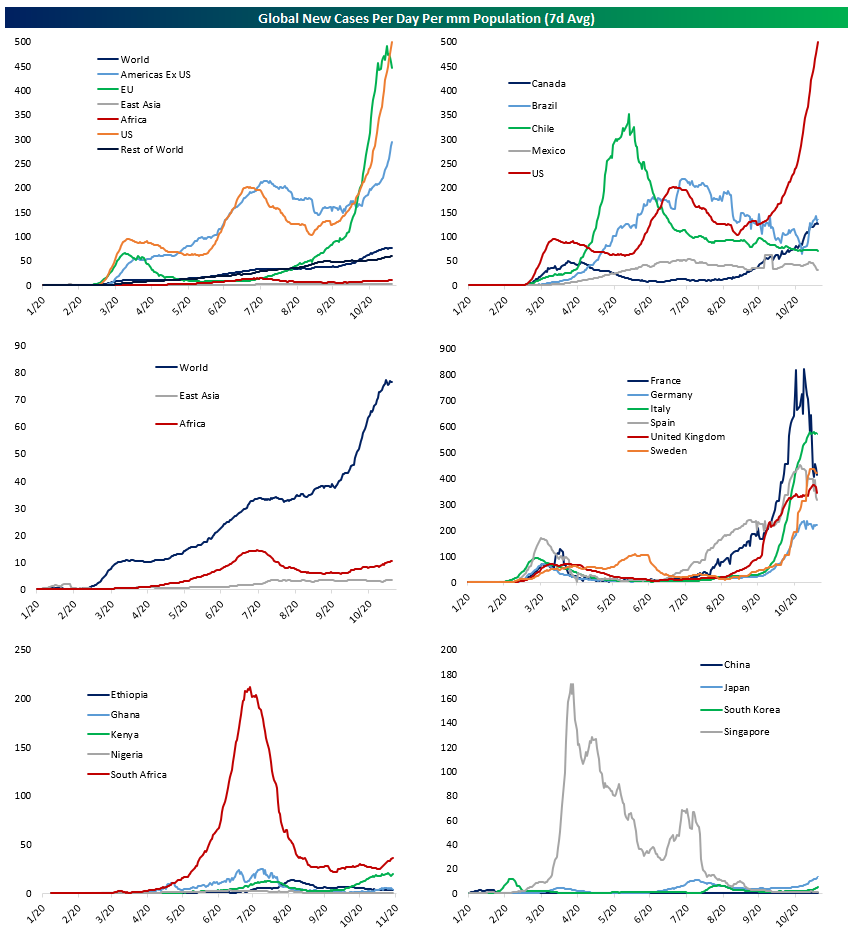 Below we show charts of new cases relative to population for a variety of regions and countries across the world at large. European cases spiked just ahead of the US. That includes Sweden, which introduced restrictions for the first time this fall amidst rising hospitalizations. We update these charts and the analysis that goes with them every morning in our pre-market report The Morning Lineup. Click here to start a free trial to Bespoke Institutional and receive our daily Morning Lineup for the next two weeks, featuring more commentary and data on macro markets.