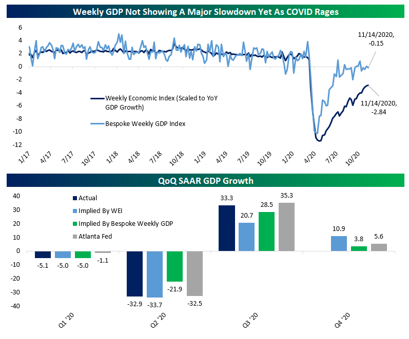 Below we update weekly economic growth trackers that we produce internally as well as the New York Fed’s Weekly Economic Index which is updated on a regular basis. Over the last five weeks, our index has reported negative YoY growth in output in four weeks, including a modest drop for the most recent week of data. For its part, the Weekly Economic Index has continued to rebound from the April lows and is at its highest levels since the March economic data collapse. That index still shows output down almost 3% YoY, but its ongoing rebound is suggesting a much stronger Q4 than what our index is tracking. Our data suggests output will be up a modest 3.8% QoQ SAAR in Q4, versus more than 10% QoQ SAAR forecasted by the WEI data. For context, Atlanta Fed GDPNow data suggests something more in-between, with their data tracking 5.6% QoQ SAAR. This analysis is published regularly in our post-market daily note The Closer. Click here to start a free trial to Bespoke Institutional and receive our daily Closer report for the next two weeks, featuring more commentary and data on macro markets.