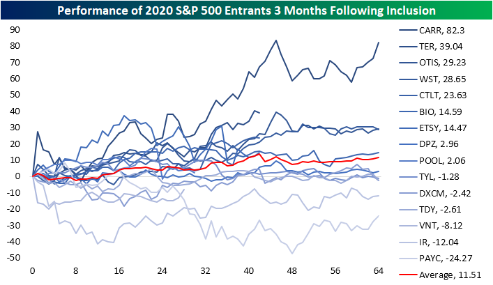 In the chart below we show the performance of just the stocks that have been included in the index since the start of 2020 from the close before the first day they trade as an S&P 500 stock through three months out. While it has not been a full three months since some of these have been added (i.e. Teradyne (TER), Catalent (CTLT), Etsy (ETSY), Pool Corp (POOL), and Vontier (VNT)), the average performance three months after inclusion has been a gain of 11.5%. Carrier Global (CARR), which was spun off of United Technologies (UTX) in the spring, experienced the largest move higher following its inclusion with a rally of 82.3%. TER is on pace for the second-largest gain having risen 39.04% since joining back in September. On the other hand, Paycom (PAYC) fell 24.27% after joining the S&P; the worst of any of these stocks.