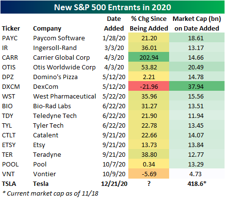 As for what this means for Tesla (TSLA) in the months to come, recent history has shown new additions to the index have been treated well by investors, but TSLA has one major distinguishing feature: its size. As shown below, TSLA’s current market cap is $418.6 billion. By comparison of other additions in 2020, on the respective date it was added to the index, DexCom (DXCM) was the largest with a $37.94 billion market cap. That is 11 times smaller than TSLA today. By that same rate, the largest stock in terms of current market cap is Carrier (CARR) at $34.98 billion. With respect to CARR, TSLA is 12 times its size even after CARR’s stock price has tripled since being included into the S&P! Click here to view Bespoke’s premium membership options for our best research available.