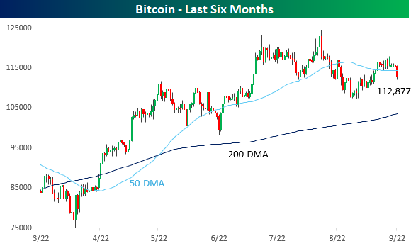 Crypto will be one place to watch for a measure of risk appetite in the market, and this morning’s action is showing a more defensive posture. Bitcoin is trading down over 2% this morning as it has broken below $113,000 and below its 50-day moving average (DMA). With today’s decline, Bitcoin is essentially trading right where it was back in May.