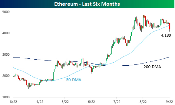 Unlike Bitcoin, which has been moving sideways, Ethereum prices had a much steeper run-up over the Summer, even as it has traded in a sideways range for the last month. This morning’s weakness in Ether has been more magnified with a decline of over 6%, and it too is below its 50-DMA for the first time in months.