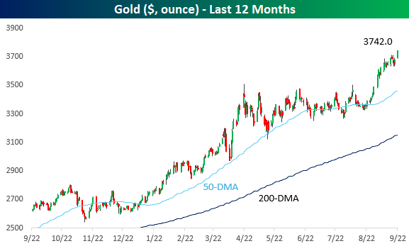After a couple of days of weakness after the Fed’s rate cut last week (if you can even call it that), gold prices are up 1.8% today and back at record highs. Today is on pace to mark the first close for gold above $3,700 per ounce, and it would be the 9th record closing high this month and the 36th record this year. Already, 2025 ranks as the fourth most record closing highs in a year for gold, trailing 1979 (57), 2024 (46), and 2011 (37).