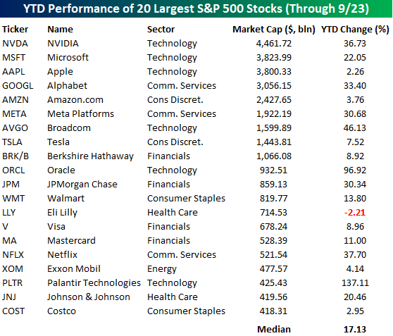 In terms of market leadership, the largest companies in the market continue to dominate. The table below lists the 20 largest stocks in the S&P 500 along with their YTD performance. All but one of them – Eli Lilly (LLY) – is up on the year, and it’s only down 2%. The median performance of the 20 stocks listed is a gain of 17.1%, with half of them rallying at least 20%, including Palantir (PLTR) and Oracle (ORCL), which are up 137% and 97%, respectively.