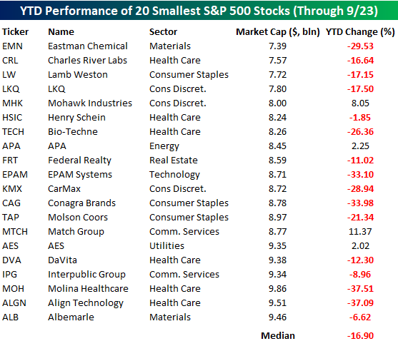 Now, contrast the performance of the 20 largest stocks with the 20 smallest stocks. Only four of the 20 smallest stocks in the S&P 500 are up YTD, and their median performance is a decline of close to 17%. It’s basically a mirror image of the 20 largest stocks. In an investment environment where passive flows should be a tide lifting all boats in the S&P 500, investors are actively abandoning ship on the smallest stocks in the index.