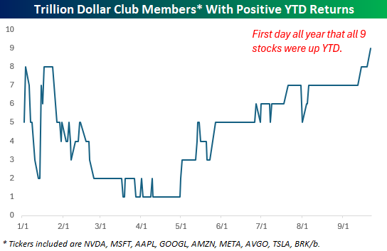 While the largest stocks in the S&P 500 have been leading the market all year, yesterday was a notable one in the fact that it was the first time all nine current members of the trillion-dollar club finished the day with a positive YTD performance. Earlier in the year, we got close with eight stocks in the black, but Apple (AAPL) was the holdout. For the first time all year, though, AAPL finished the day with a positive YTD gain yesterday, joining the eight others in the party.