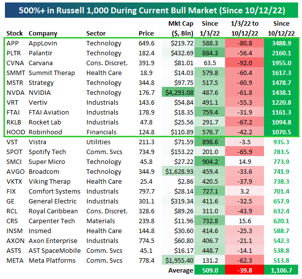 Since 10/12/22 – a little over a month before the launch of ChatGPT on 11/30/22 – US stocks have been in what we call the “AI Boom” bull market. While broad market performance has been robust, one striking aspect of this cycle has been the extraordinary gains in a handful of individual equities. Ten stocks in the large-cap Russell 1,000 have now advanced more than 1,000% since the start of this period. These “10-baggers” reflect a mix of AI-driven demand, structural turnarounds, and thematic speculation. Below we take a look at each of these names to provide insight into the breadth of forces powering this bull market beyond the headline indices.