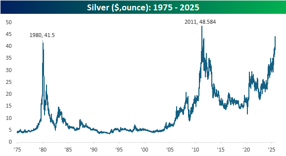Silver is getting to some interesting levels as well. At $44 per ounce, the bridesmaid of precious metals is right in between its 1980 and 2011 peaks. Back in 2011, when silver made new highs, the breakout was fleeting, but now 15 years later, it’s knocking on the door of new highs once again. Time will tell if silver can make a successful breakout this time, but with runs to new highs being as frequent as the emergence of various cicada species, it doesn’t want to waste its chance!