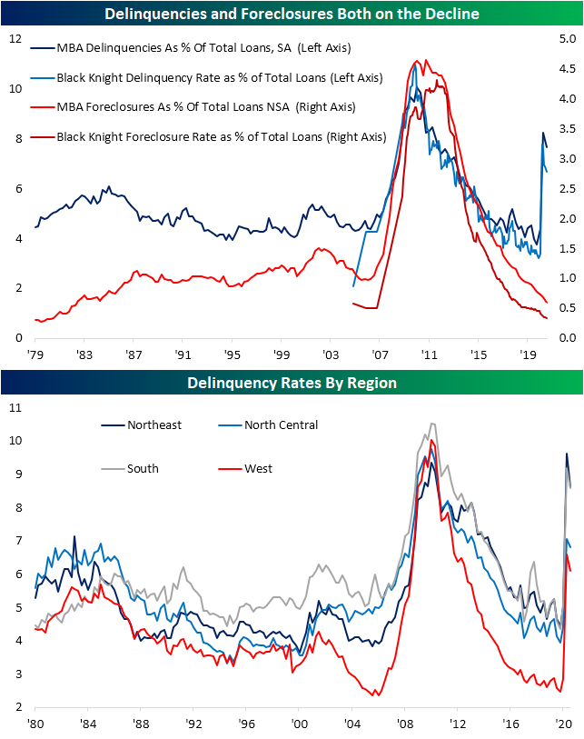 In an earlier post, we noted how data from the Mortgage Banker’s Association has shown that although purchase activity has been on the decline in recent weeks, activity remains at strong levels. Elsewhere in MBA data released this week, yesterday the group put out delinquency and foreclosure figures for the third quarter. Delinquencies improved in the third quarter with the rate falling from a nearly decade high of 8.22% to 7.65%. That decline is consistent with the delinquency rate from Black Knight which showed delinquencies fall from 6.88% in August to 6.66% in September. The MBA also released their quarterly reading on foreclosures. As we have noted in the past with the equivalent Black Knight data, moratoriums and other freezes have led the foreclosure rate to continue to fall to fresh lows. The MBA’s reading, which goes further back, fell to 0.59% in the third quarter; the lowest reading since 1982.