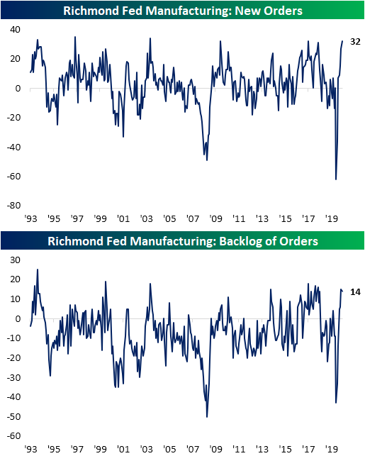 In addition to manufacturing data, the Richmond Fed also includes indices of the service sector. Whereas demand continues to surge for the region’s manufacturers, service sector demand has continued to improve but decelerated in October. Despite this, revenues have continued to rise sharply. Similarly, the index for Employees saw a significant uptick in October rising 12 points. The October reading is now indicative of rising levels of employment for the first time since March. Additionally, while the manufacturing survey indicated modest increases in prices, the services data indicates prices are running a bit hotter, particularly for prices paid. Click here to view Bespoke’s premium membership options for our best research available.