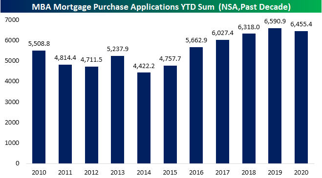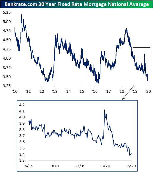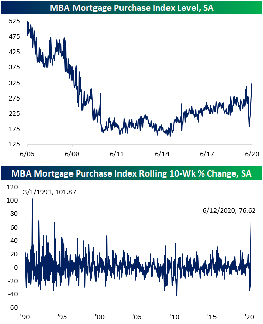 Despite the recent strength, the damage from weakness earlier in the year still hasn’ been undone. Looking at the YTD sum of purchase applications through the current week of the year (24th week) applications are down roughly 2% in 2020 vs 2019. Given that the US is in the midst of a global pandemic, however, it could be a whole lot worse. Click here to view Bespoke’s premium membership options for our best research available.