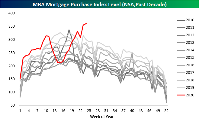 In addition to low rates, due to the COVID-19 shutdowns occurring during what is a seasonally strong time of year, seasonal catch up is also providing a boost this year. As shown below, the past few weeks have seen some of the strongest readings for the specific week of the year of the past decade. That comes shortly after shutdowns resulted in the weakest readings of the past decade for the weeks around March and early April. Additionally, purchases have continued to rise despite the annual peak typically having already occurred by this point in the year. In the past decade, the annual peak for purchases is usually put in place by mid-April or mid-May. The only year with an annual peak later than that was 2015 on account of a change in mortgage disclosure rules leading to a one time surge in purchase applications. While 2020 is far from over, the continued strong readings are sure to make a later seasonal peak than normal.