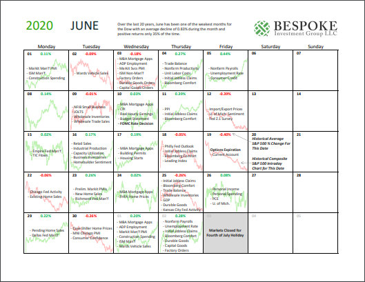 Please click the image below to view our June 2020 market calendar. This calendar includes the S&P 500’s average percentage change and average intraday chart pattern for each trading day during the upcoming month. It also includes market holidays and options expiration dates plus the dates of key economic indicator releases. Start a two-week free trial to one of Bespoke’s three research levels.