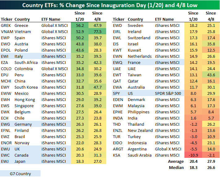 Along with being the second-best-performing country ETF since Inauguration Day, Vietnam (VNAM) has easily been the best performer since April 8th with a gain of 77.5%. On the flip side, Saudi Arabia (KSA) is the only country ETF that is down over both periods (-10.9% since 1/20, -2.1% since 4/8). Argentina (ARGT) and Indonesia (EIDO) are two others that are now solidly red since 1/20, while India (INDA) is up just 1.6% since 1/20 and 5.7% since 4/8 (second worst).