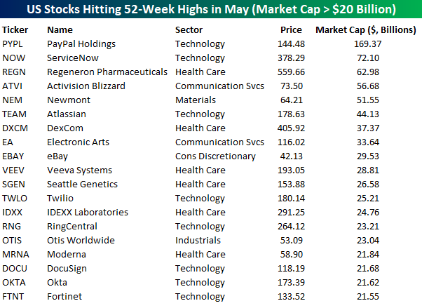 If you’ve been paying attention over the last few weeks, all you’ve heard is how the large mega-cap tech stocks have been keeping the market afloat. The five largest stocks in the US (Microsoft, Apple, Amazon, Alphabet, and Facebook) have done extraordinarily well this year and since the March lows, but to say they’ve been doing all the lifting would be inaccurate. Take for example the fact that of the 2,052 US stocks with market caps above $500 million, 101 (4.9%) have hit 52-week highs so far in May and none of them are named Microsoft, Apple, Amazon, Alphabet, or Facebook. The table below lists the 19 US stocks with market caps above $20 billion that have hit 52-week highs so far this month. Looking at the list, only one of the names listed (PayPal) has a market cap above $100 billion and just four others have market caps above $50 billion. Not only are these names not mega-caps, but many of them are also stocks that most people have probably never heard of.