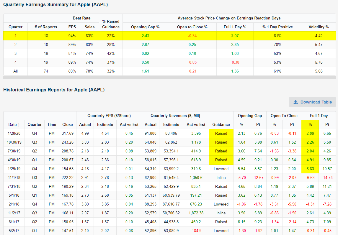 Our Earnings Explorer tool lets users conduct in-depth analysis of individual companies and how their share prices typically react to quarterly results. Below we highlight the ins and outs of quarterly earnings for the five largest stocks in the S&P 500 — all of which report Q1 results this week.