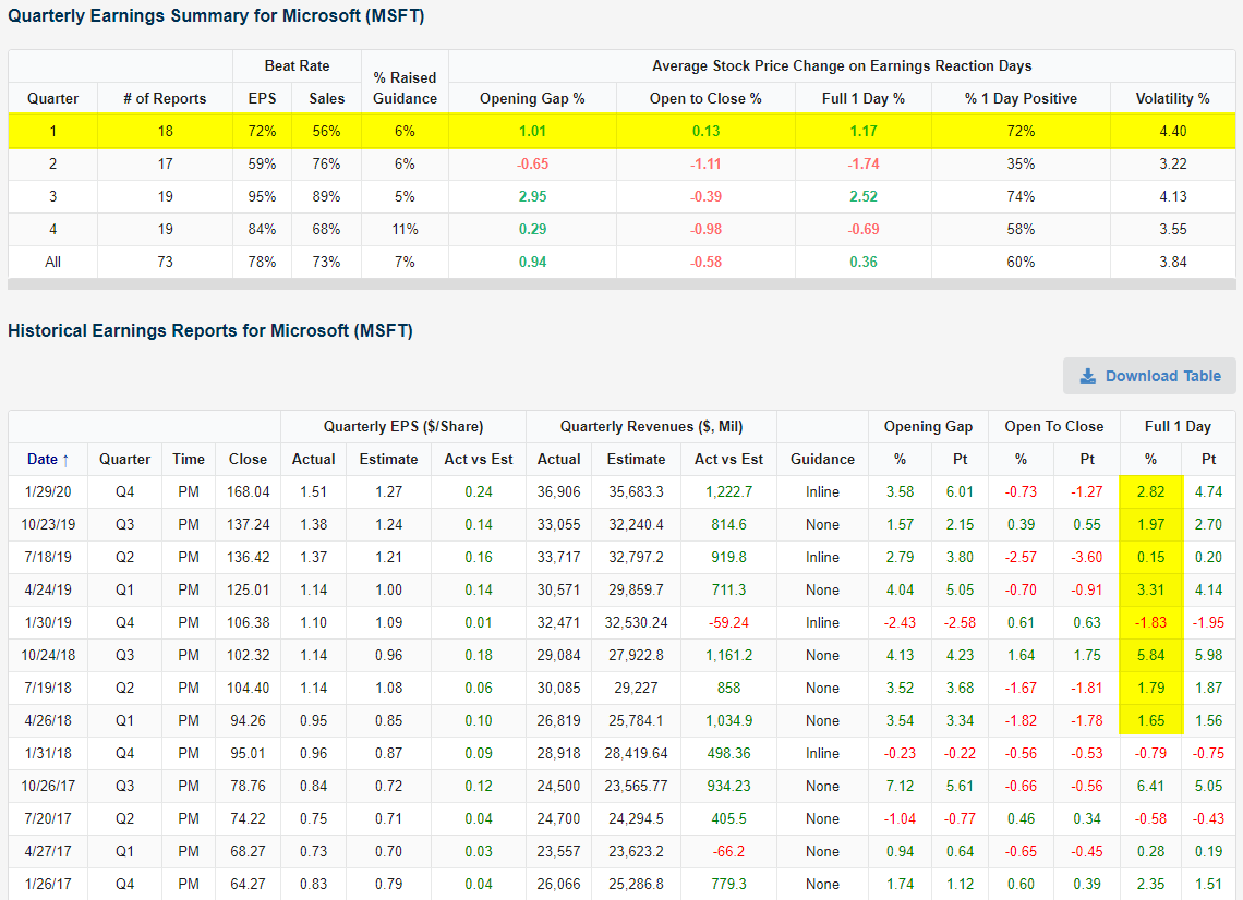 Microsoft (MSFT) heads into Q1 earnings as the largest stock (by market cap) in the S&P 500 and on a bit of a hot streak. As shown in the snapshot below, MSFT has seen gains on seven of its last eight earnings reaction days dating back to April 2018. On Q1 earnings days, MSFT has averaged a full day gain of 1.17% and has closed higher 72% of the time. Q3 is the only other quarter that has seen MSFT average gains on earnings reaction days. The worst quarter for MSFT earnings has historically been Q2 (reported in July). MSFT has averaged a decline of 1.74% on its Q2 earnings reaction days with positive returns only 35% of the time.