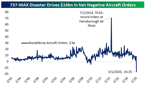 Today’s preliminary report on manufacturers’ new orders, sales, and inventories was mixed, with a huge headline drop but stronger results under the hood…especially relative to disastrous manufacturing sentiment series in March and April. Leaving aside the broader implications of the report, we wanted to highlight one series in particular. With Boeing (BA) reeling from the ongoing problems with its 737-MAX design and the global shock to its customers in the form of COVID-19, the US aerospace industry is under immense pressure. Things are so bad that orders are being canceled faster than new orders are placed. That situation is not without precedent; it applied for a stretch in 2008-2009 as well. But the scale of net negative order growth is much, much larger this time around. Across all US manufacturers in March, $16.35bn more orders were canceled than new orders received. Start a two-week free trial to Bespoke Institutional to access our Chart Scanner, custom screens, and much more.