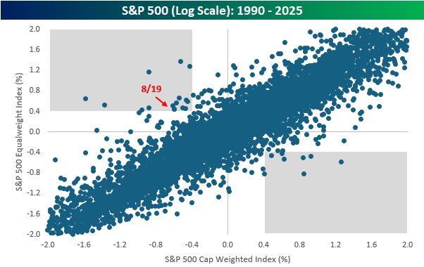 Divergent days like yesterday, where the cap-weighted index declines at least 0.4% while the equal-weighted index rises at least 0.4% have been very uncommon. Since 1990, yesterday was only the 16th occurrence, and there have only been eight days where the opposite occurred (cap-weighted index up 0.4%+ and equal-weight index down at least 0.4%).