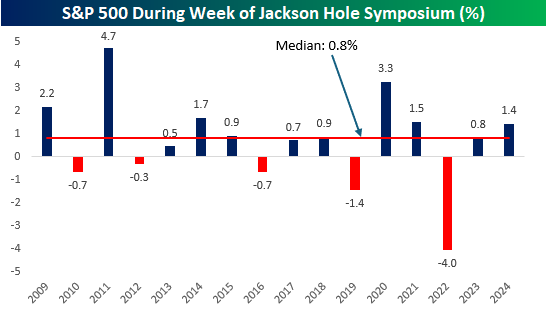 The chart below shows the S&P 500’s performance in the week of the Jackson Hole conference every year since the end of the Financial Crisis in 2009. More often than not, it’s been a positive week. Of the 16 years shown, the S&P 500 has only been down five times, with only two years where the drop was more than 1% (2019 and 2022). Overall, the S&P 500’s median performance has been a gain of 0.8%.