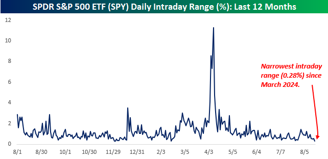 Yesterday was a tough day in the market – to stay awake. From the opening to closing bell, the SPDR S&P 500 ETF (SPY) traded in a range of 0.28% which was the narrowest intraday range since March 2024. To put yesterday’s range in perspective, the intraday range of the market on April 9th at the height of the tariff drama was more than 40 times larger.
