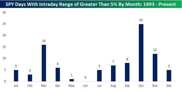 On the flip side, just for fun, we also looked at which months most frequently have seen 5% intraday ranges in SPY. Unsurprisingly, October has been the clear leader with 25, followed by March with 16. Here again, the high frequency of occurrences in March is primarily due to 2020, when there were 12, and the only four other occurrences were in 2009, around the lows of the Financial Crisis.