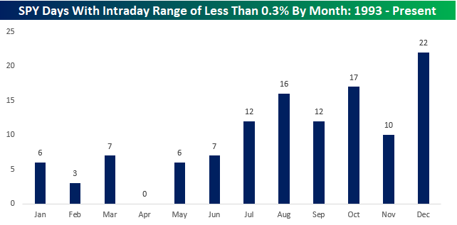 Given that we’re in August, it shouldn’t come as too much of a surprise that the market has been quiet. Since the launch of SPY back in 1993, August has seen the third-highest frequency of days when the ETF’s intraday range was narrower than 0.3%. The only two months with a higher frequency were October (17) and December (22). December makes sense given the holidays, but the fact that October has had the second-highest frequency of days with an intraday range of less than 0.3% was surprising. Digging a little deeper, we found that more than half of them (9) occurred in October 2017. That could have been the most docile month of trading in SPY’s history!