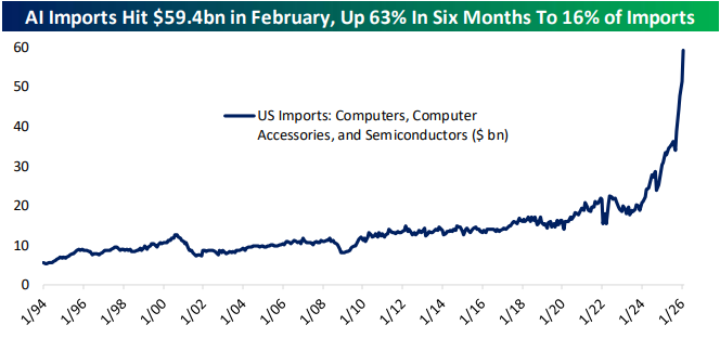 • Imports of categories related to AI spend are going absolutely gangbusters with total import bill of just below $60 billion in February, up 63% in six months.