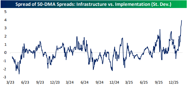 Looking for deeper insight into markets? In tonight’s Closer sent to Bespoke Institutional clients, we lead off with some commentary regarding the Fed and the Supreme Court in addition to the latest concerning Greenland (page 1). Next up, we show the massive divergence between AI Infrastructure and Implementation stocks (page 2).  We then review the latest earnings (page 3) before closing out with a recap of today’s construction spending and pending home sales data (page 4).
