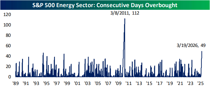 - The Energy sector has now traded in overbought territory for 49 consecutive trading days; the second longest streak of overbought readings on record.