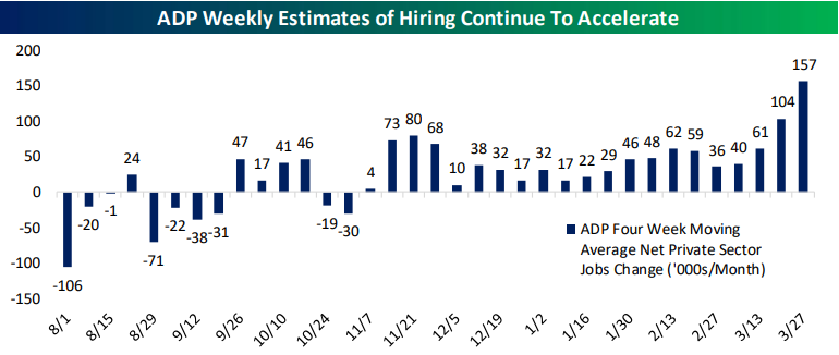 • ADP estimates 157K total private sector jobs were added in the four weeks ending March 27, easily the best result in series history.